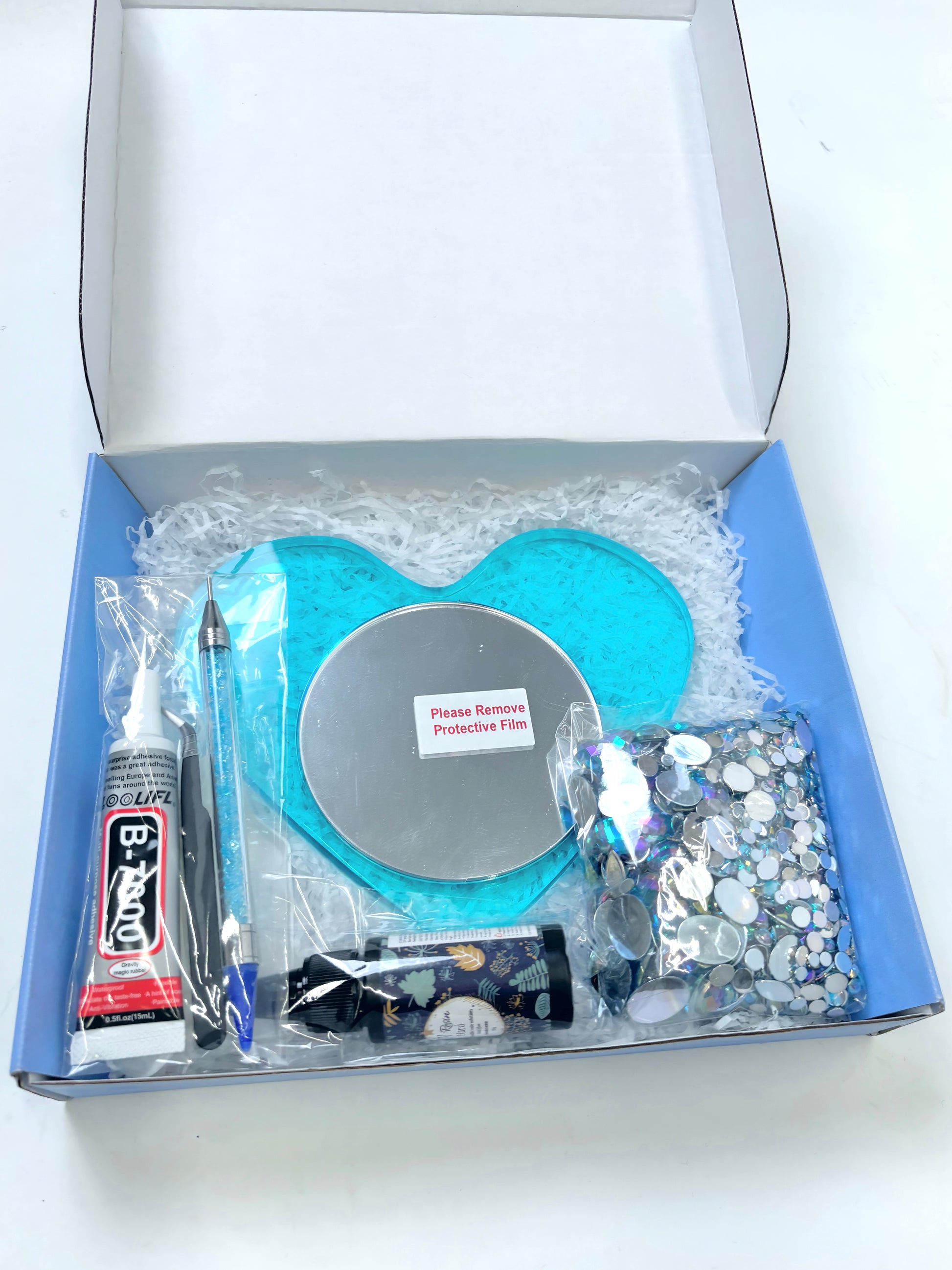 The Aqua Rhinestone Decorative Mirror Kit - is a fun, beginner-friendly DIY kit inspired by our signature Aquamarine Rhinestone mirror. Personalise a handmade mirror frame with iridescent rhinestone gems.